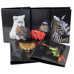 Zakladač krúžkový, 5 rôznych vzorov zvierat (2 z každého), vo vnútri s čirnobielou potlačou, pre formát DIN A4, 2 krúžky, priemer krúžku 25 mm, lesklý laminovaný papierový povrch.| Vlastnosti produktu | |