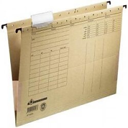 Závesné obaly z recyklovaného papiera gramáže 230 g na dokumenty formátu A4 s bočnicami. Súčasťou obalov je násuvný index z priehľadného plastu s výmenným papierovým štítkom. Farba prírodná hnedá. Väčšie balenie 25 ks.| Vlastnosti produktu | |