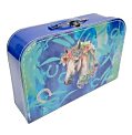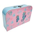 Papierový kufrík na školské pomôcky, lesklý, s vnútornou grafikou, kovové zatváranie. Rozmery: 35 × 23 × 10 cm. Motív: Morský koník.