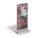 Stojan vhodný na prezentáciu ľubovoľných informácií s dobrou stabilitou. Vrchná časť vyrobená z kvalitného číreho akrylu, elegantný podstavec z hlíníka.Rozmery: 150x237x85 mm