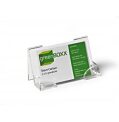 Priehľadný box z plastu so 4 rovnocennými priehradkami na skladovanie vizitiek. Kapacita 240 vizitiek. Možnosť spájania viacerých boxov pomocou spájacieho prvku. Farba číra.Kapacita: 240 vizitiek