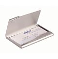Elegantná a praktická hliníková krabička na vizitky. Vnútorné rozmery 90 × 55 mm. Kapacita 2 × 10 vizitiek. Vnútorný priestor rozdelený priečkou na 2 časti. Matná úprava. Farba strieborná.Vnútorné rozmery: 90 x 55 mmKapacita: 2x10 vizitiekÚprava: strieborná matná